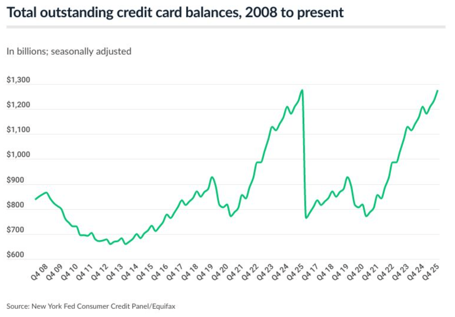 "Americans’ total credit card balance is $1.277 trillion as of the fourth quarter of 2025, according to the latest consumer debt data from the Federal Reserve Bank of New York. That’s up from $1.233 trillion in Q3 2025 and is the highest balance since the New York Fed began tracking in 1999.